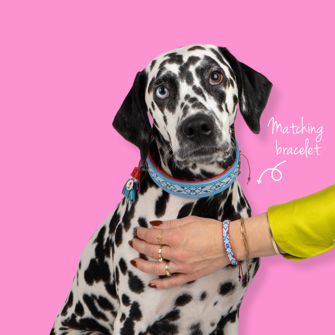 Unser handgefertigtes Armband wurde speziell entworfen, um perfekt zum Halsband deines Hundes zu passen. Mit seinem farbenfrohen Boho-Design und den liebevollen Details strahlt dieses Set nicht nur Stil und Exklusivität aus, sondern bringt euch auch näher zusammen.