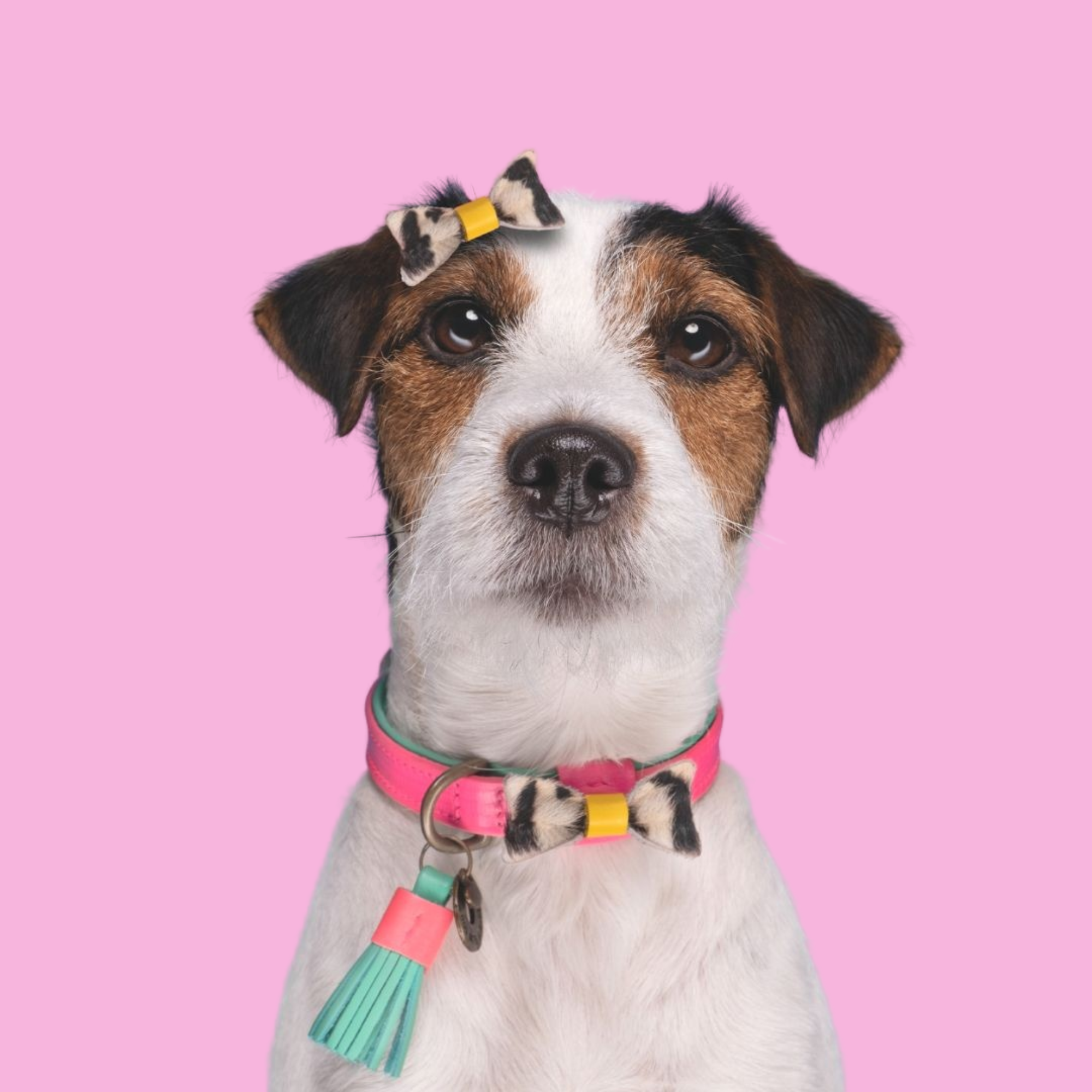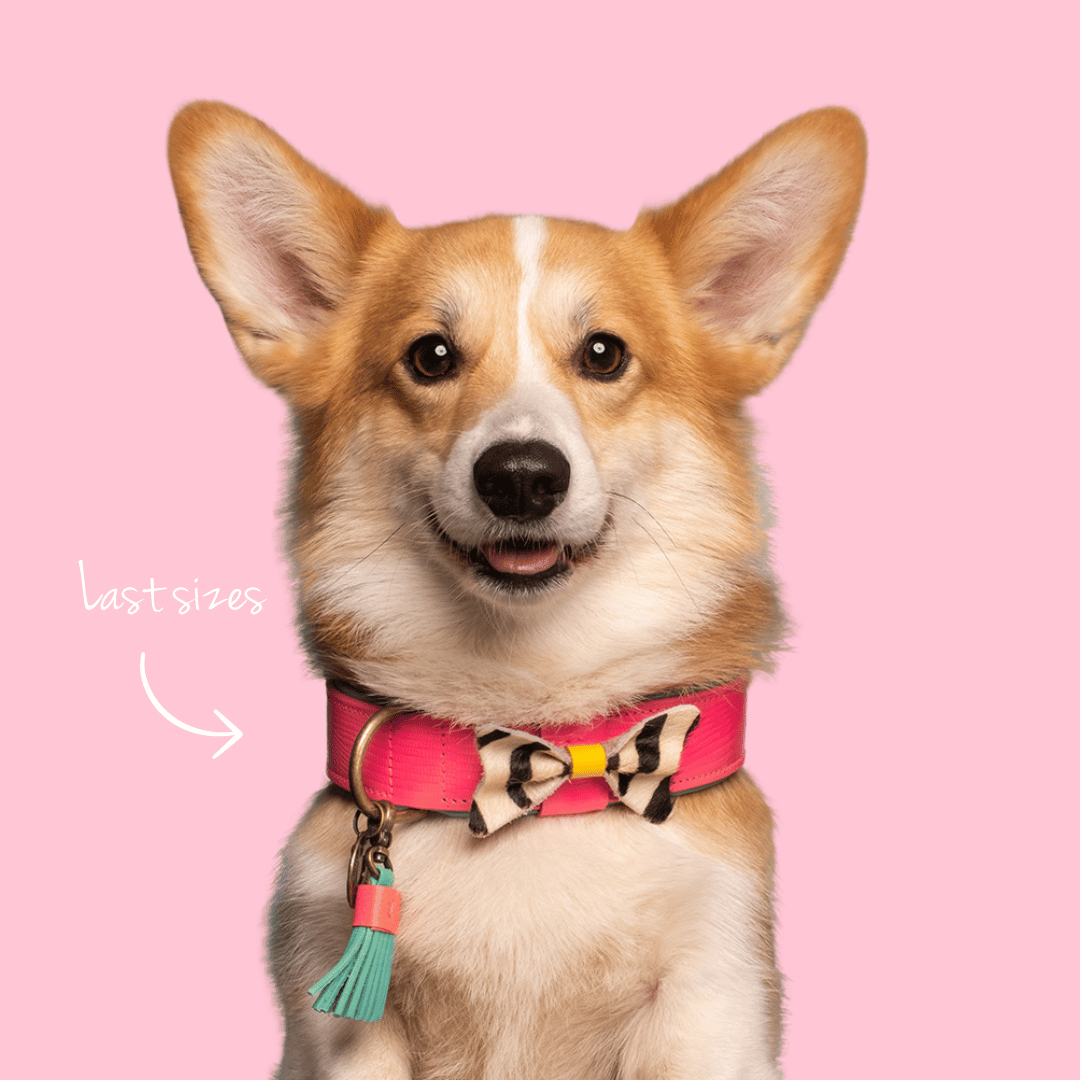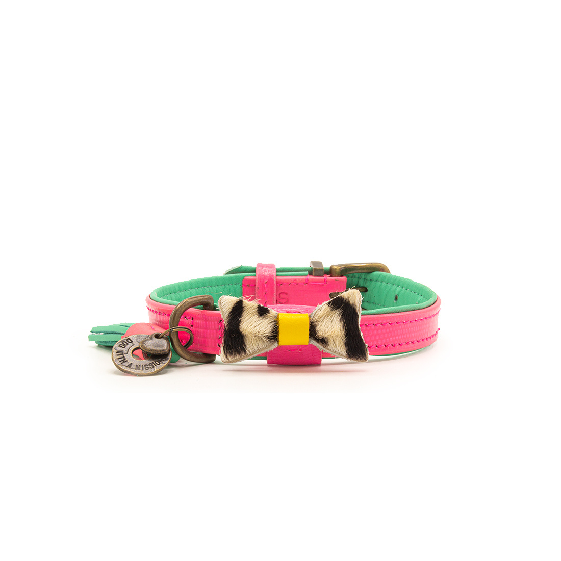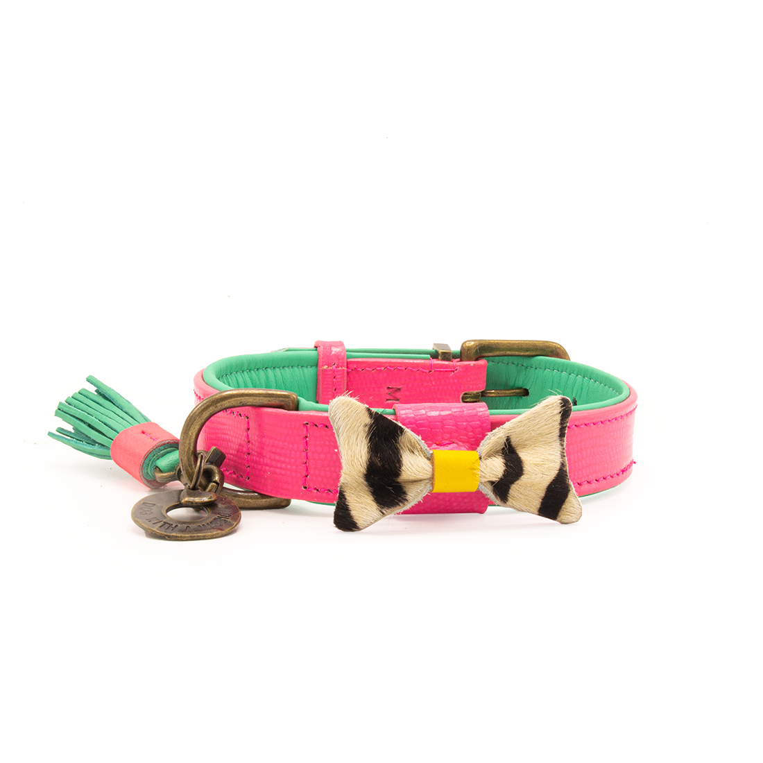 This must be the most colorful DWAM combo for the summer. For when a normal bow tie is just too normal, right? This beautiful pink collar is finished with a zebra print bow tie, a DWAM turquoise comfy soft leather inside, and yellow details.