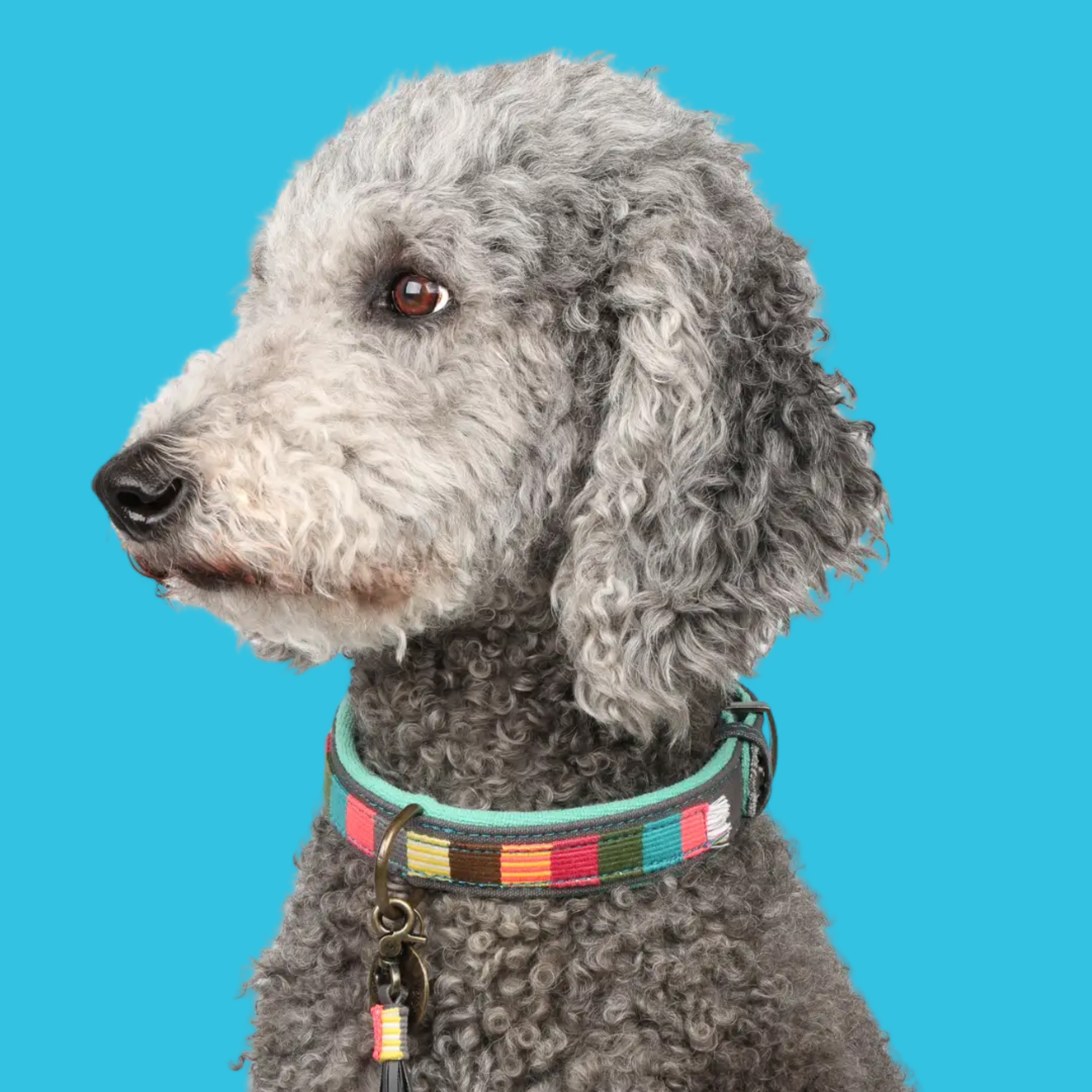 ❤︎ Gekleurde Stofafwerking: De halsband is gemaakt van robuuste stof met een opvallend, kleurrijk strepenpatroon dat zorgt voor een levendige uitstraling.